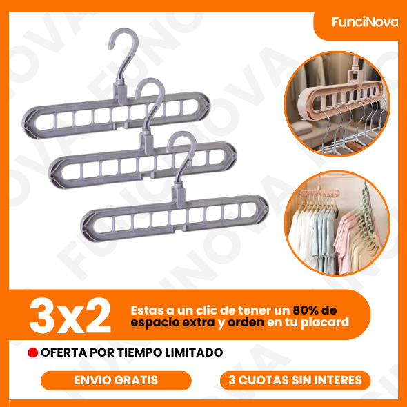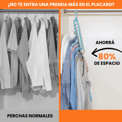 Sí, ¡y mucho! 🙌 Gracias a su diseño giratorio y los 9 agujeros por percha, podés colgar varias prendas en una sola. En la práctica, liberás hasta un 80% más de espacio sin tener que cambiar tu placard.